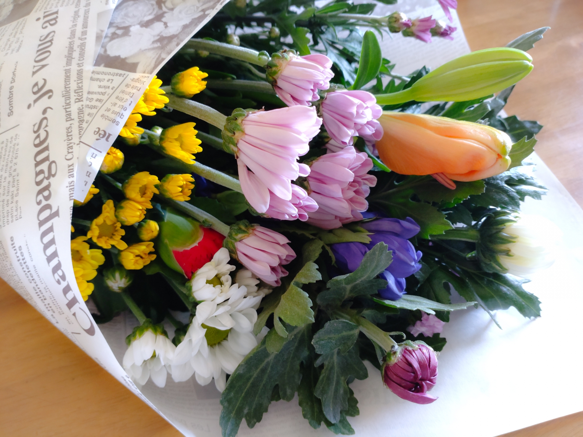 奥さんが買ってきた花を「きれいだね」と一緒に眺める。